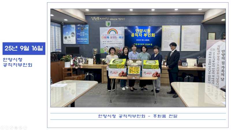 25년 9월 16일 안양시청 공직자부인회 후원품 전달 페이지 정보 작성자 운영자 댓글 0건 조회 57회 작성일 26-01-31 10:59 본문 안양시청 공직자부인회에서 아이들을 위해 사과, 멜론, 포도, 감귤 등 몸에 좋은 과일들을 후원해 주셨습니다. 감사합니다. 목록 이전글25년 9월 17일 안양건강보험관리공단 후원금 전달 26.01.31 다음글25년 9월 15일 (주)아인스 후원품 전달 26.01.31 댓글목록 댓글목록 등록된 댓글이 없습니다.