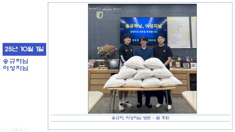 25년 10월 1일 송규하, 이성지님 후원품 전달 페이지 정보 작성자 운영자 댓글 0건 조회 63회 작성일 26-01-31 12:15 본문 송규하, 이성지님께서 방문하여 쌀을 후원해 주셨습니다. 감사합니다. 목록 이전글25년 10월 1일 시민정원사 정원 조경봉사 26.01.31 다음글25년 9월 29일 안양과천교육지원청 후원금 전달, 9월 일정공지 26.01.31 댓글목록 댓글목록 등록된 댓글이 없습니다.