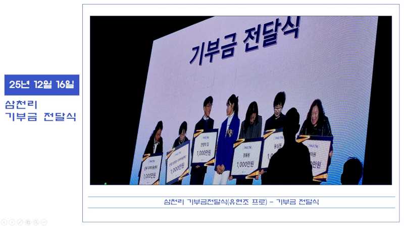 25년 12월 16일 삼천리 기부금 전달식(유현조 프로) 페이지 정보 작성자 운영자 댓글 0건 조회 6회 작성일 26-02-02 16:54 본문 삼천리 스포츠단 유현조 프로님께서 안양의집에 기부금을 전달해 주셨습니다. 감사합니다. 목록 다음글25년 12월 12일 펄어비스 김대일문화재단 - 정장 지원사업 전달식 26.02.02 댓글목록 댓글목록 등록된 댓글이 없습니다.